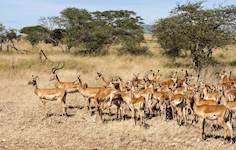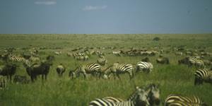 Today we'll immerse one more time into a full safari adventure, spotting lions and leopards and in this area as well as relatively easy-to-sight cheetahs, especially where there are large amounts of prey such as gazelle. Our game drive will lead us into the central Seronera region of the Serengeti National Park, which sprawls across 5,757 square miles, and is Tanzania’s largest and most famous national park. Most of the park is open swathes of grassland, broken by isolated granite kopjes (hills) and patches of acacia woodlands. Famous for its cheetah, Cape buffalo, and large herds of giraffe, the chief herbivore of Serengeti is the wildebeest of which there are up to two million. The amazing annual migration of wildebeest herds is one of the biggest attractions of the Serengeti. It begins November at the northern end of the Serengeti National Park near the Kenyan border, when huge herds of these animals cross into Tanzania from the Maasai Mara area in Kenya to head for greener pastures in the South Serengeti and Ndutu. By December they've arrived and begin feeding on the lush short-grass plains. Now the zebras reach their peak of foaling, and the wildebeest and gazelle also give birth to their young. It's a predator haven with an abundance of game animals seen nowhere else on earth. We’ll have a box lunch today to allow us to stay moving through the stunning landscape of endless plains, dotted with animal herds.