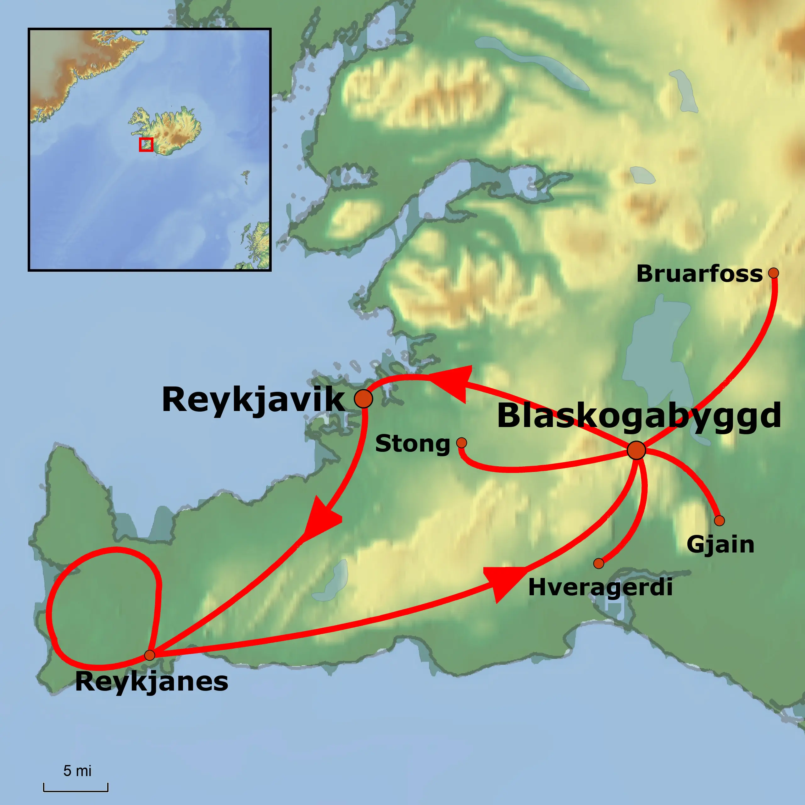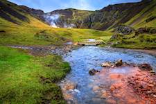 After breakfast, this morning we'll hike to one of Iceland's most beautiful sites, Bruarfoss...the Blue Waterfall. Amazing that so few people ever visit this magical place, but then again it is not easy to find. The water here is so blue it's hard to capture the charm in pictures. Even the trek along the river to this wonderful place is a constant overload on the senses. Once we return back to the hotel, we have some time before setting off for the Geysir area. The main attraction in the area is Strokkur (The Churn), another geyser 100 meters south of the Great Geysir, which erupts at regular intervals every 10 minutes or so, and its white column of boiling water can reach as high as 30 meters. The whole area is a geothermal park sitting on top of a vast boiling cauldron. Belching sulfurous mud pots of unusual colors, hissing steam vents, hot and cold springs, warm streams, and primitive plants can all be found here. After Geysir the group will head to Friðheimar Tomato and Horse Farm to visit a greenhouse oasis amidst the starkly beautiful Icelandic landscape. As soon as you step inside, you are enveloped in a lush world of greenery and warmth. The greenhouse is filled with row upon row of plants, from delicate herbs to towering tomato vines. The air is thick with the scent of fresh basil and thyme, and the sound of water trickling from the hydroponic systems adds a soothing soundtrack to the experience. But the true magic of this greenhouse lies in its sustainability practices; the greenhouse relies on geothermal energy to power its systems, making it an environmentally friendly oasis in the heart of the Icelandic wilderness. As you wander through the rows of plants, it's easy to forget that you're in the middle of a desolate landscape - for a brief moment, it feels like anything is possible in this vibrant, thriving ecosystem.The group will enjoy a tomato soup lunch with fresh baked bread of which Friðheimar is famous for. The next stop of the day will be at the Secret Lagoon or the Old Swimming Pool as it is known in Icelandic, a hidden oasis surrounded by breathtaking landscapes. The lagoon, with its bubbling hot springs, offers a unique and tranquil escape into nature's beauty. The Secret Lagoon is located in Fluðir at the entrance to the city. In 1891, locals built this large pool using the geothermal properties of the Fluðir region, making it the oldest natural pool in the whole country and a favorite destination for spa lovers with water between 100 and 104 °.