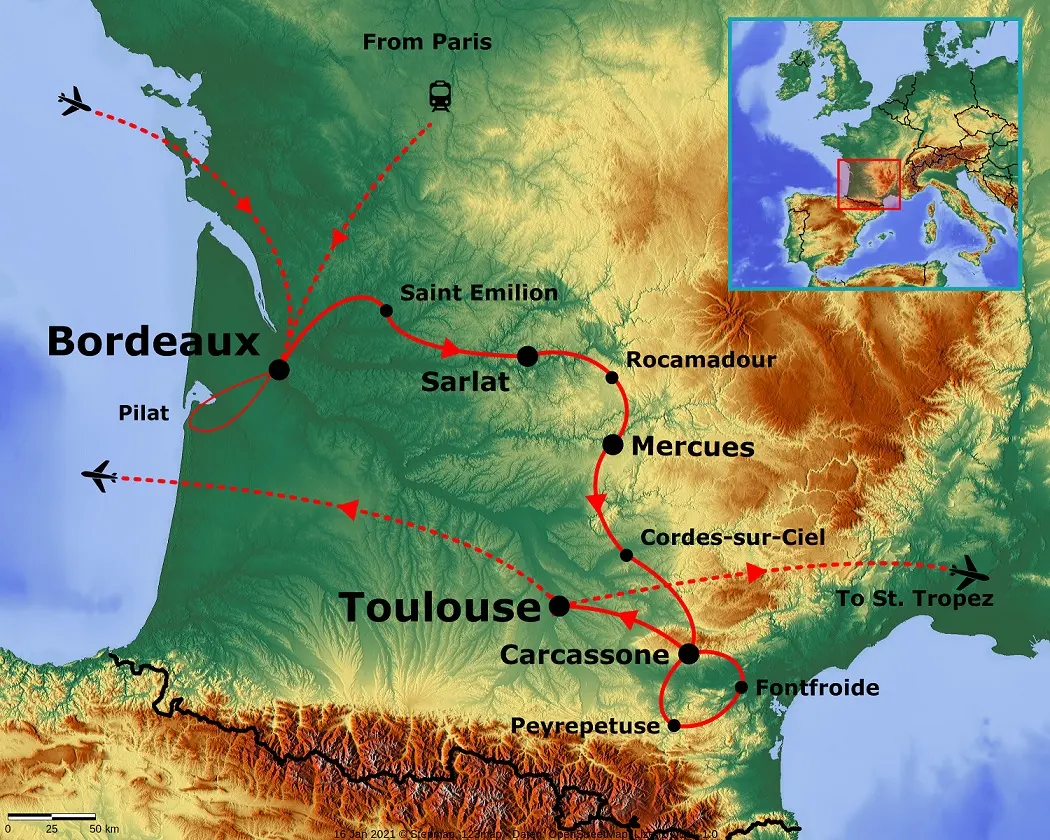 We’ll walk through diverse and breathtaking landscapes, marvel at the fascinating culture, enjoy the exquisite food and taste world-class wines from some of France’s legendary vineyards! This distinctive tour starts in the far southwest wine region of Bordeaux, on the windswept Atlantic coast, and winds its way across the entire south of France to the cosmopolitan city of Toulouse. This area has an overabundance of natural beauty and historical places, with smaller towns and villages dotting the rugged landscape