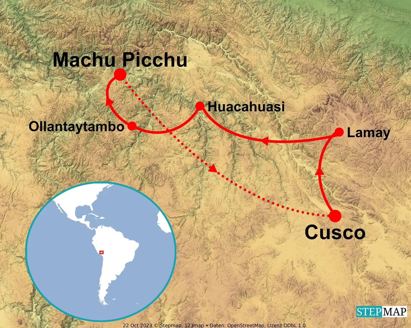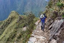 OPTIONAL KM104 Hike: This hike is rated #5 CHALLENGING with a total distance of 5.9 miles and a hiking time of 5-6 hours. You'll have 3337 feet of ascent and 2480 feet of descent. The trail begins at 7110 feet of altitude, climbs to the highest point at 8878 as you approach Machu Picchu, then descends to 7966 feet at the end. The terrain is rolling, with some section of steep, rocky inclines.
