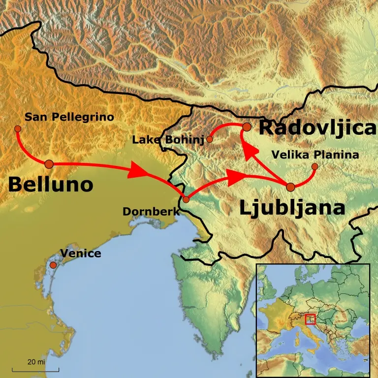 • Arrival and departure transfers, tour begins at the hotel in Belluno on the afternoon of Day 1, and the tour ends in your Ljubljana hotel on the morning of day 8.