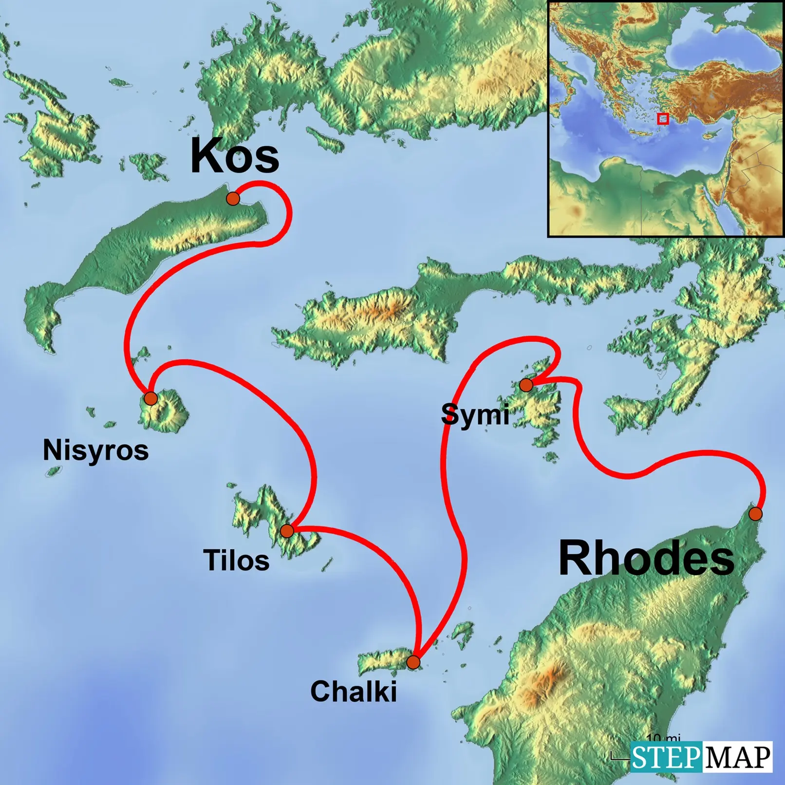 After we depart the harbor in late afternoon, we'll enjoy relaxing on deck while we journey to the harbor of Mandraki, on Nisiros island. Nisiros island means 'the place with figs'- but it is better known for its volcano which erupted in 1422 and is still active. Apart from being the capital of the island, Mandraki is also its harbor. It is one of the biggest villages on Nisiros, and you can enjoy a stroll around the exquisite pebbled narrow streets and squares (most typical of all being the Square of Dolphins) and take a close look at the white or colored two-story houses with wooden balconies. The houses are made of volcanic rocks and insulated with pumice-stone. The nightlife is not very intense, but our group can make their own party in one of the little tavernas of Mandraki.