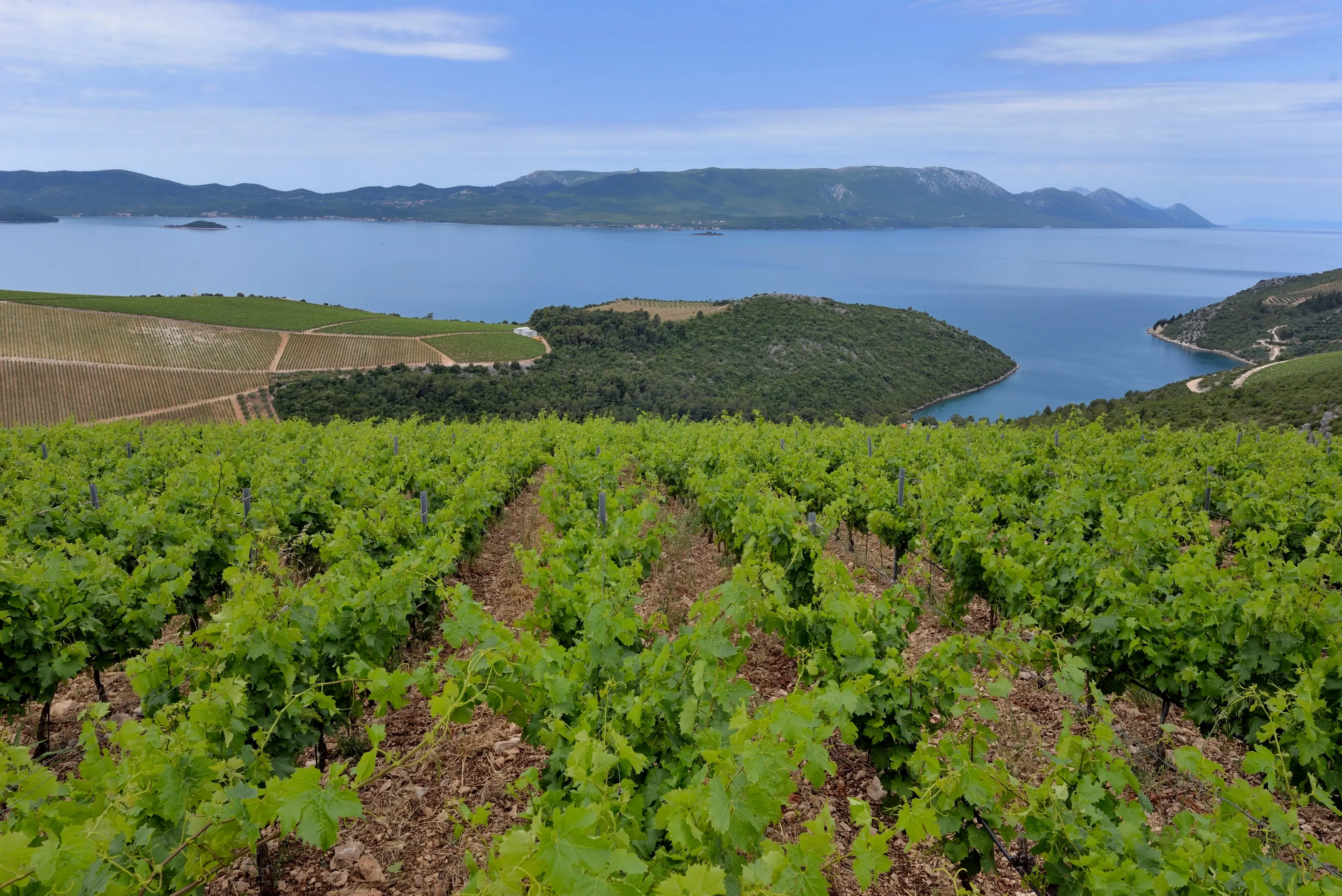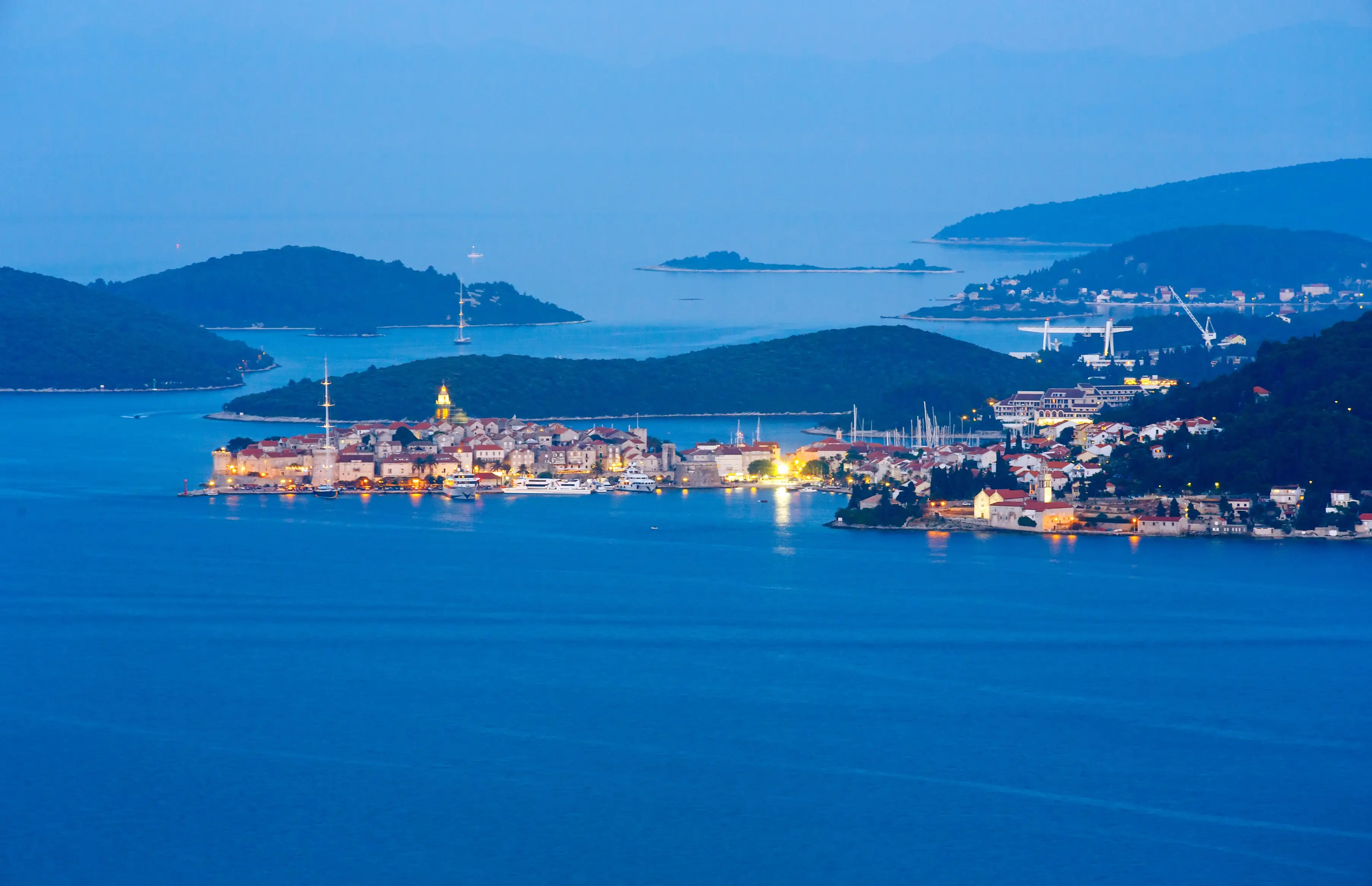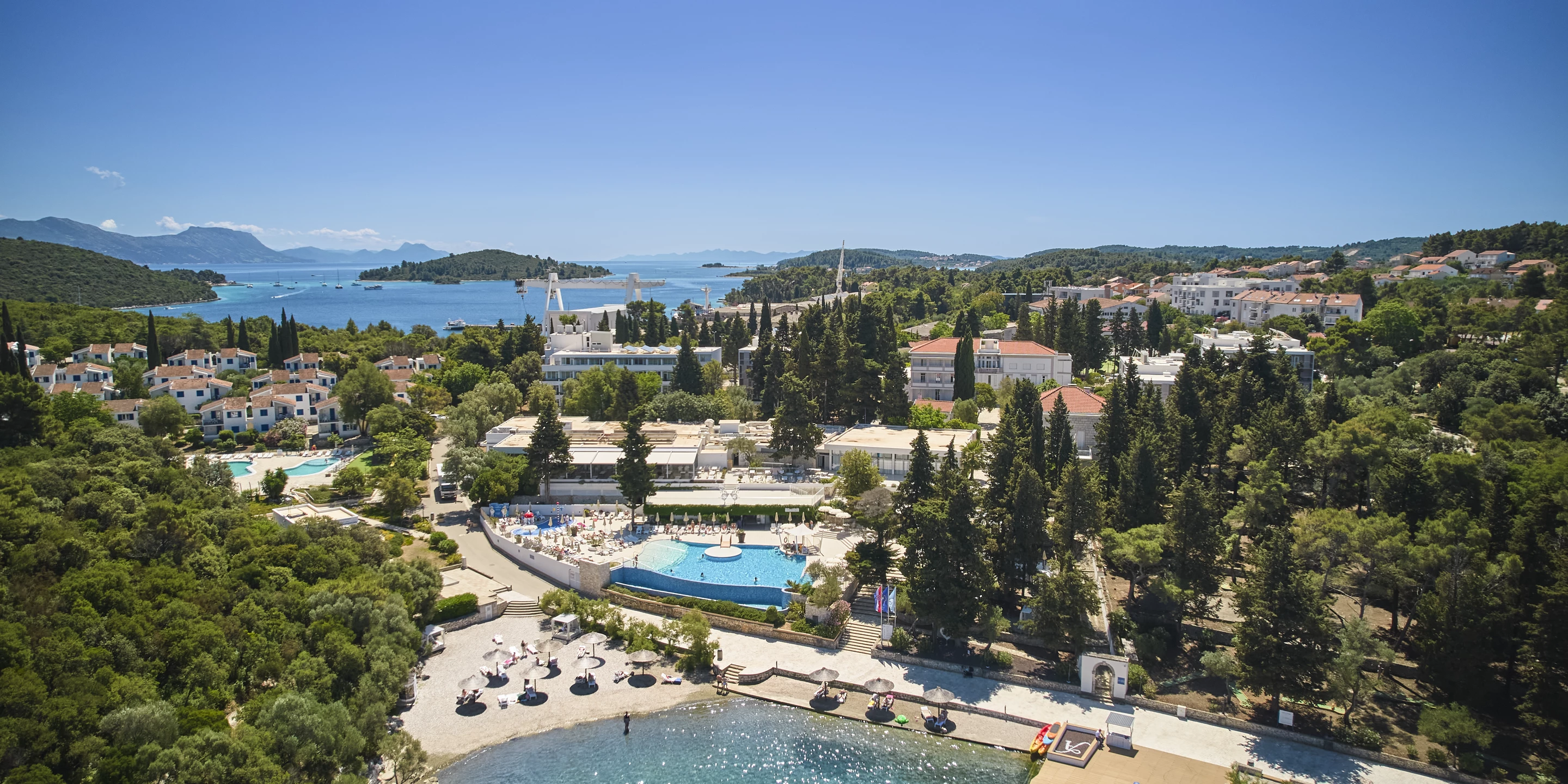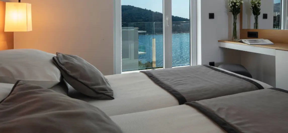 Aminess Vival Port9 Resort delights with its views of Luka Bay and the Pelješac Mountains in the distance.